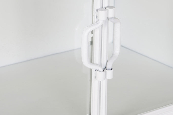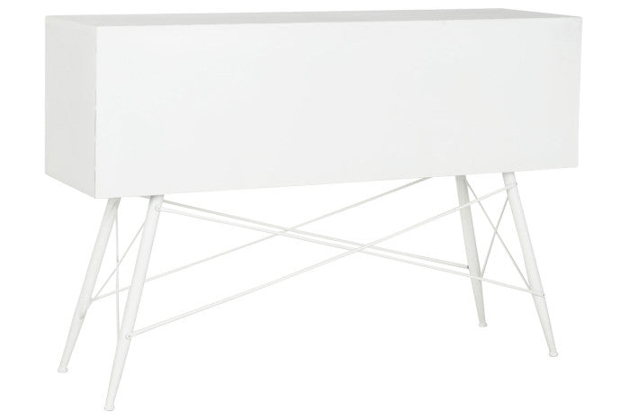 Consola realizada en metal blanco con cuatro puertas abatibles en cristal.