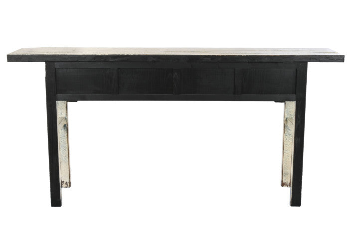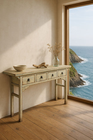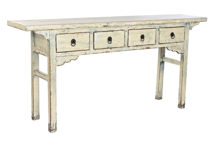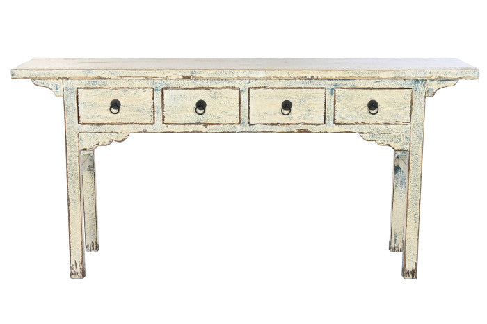 Consola realizada en madera de olmo en tono blanco y reflejos turquesa con cuatro cajones y acabado decapé.