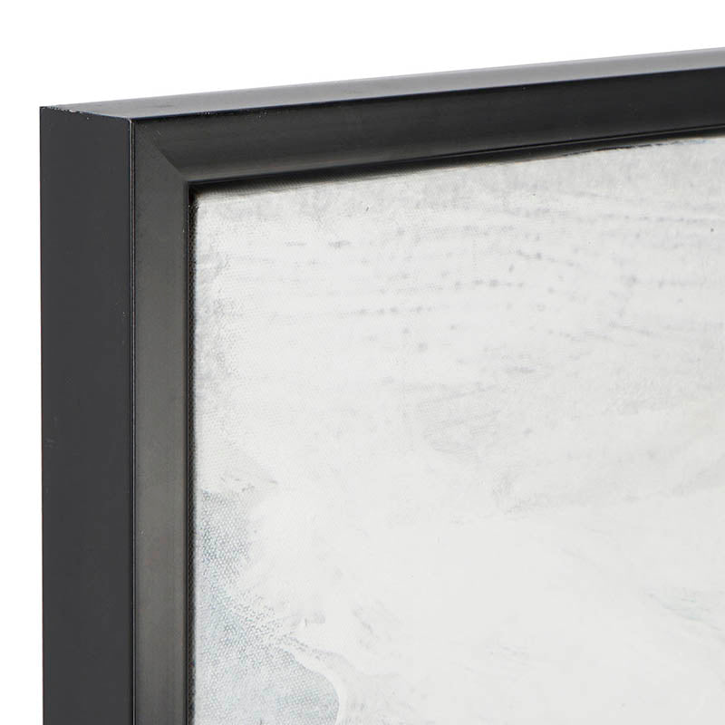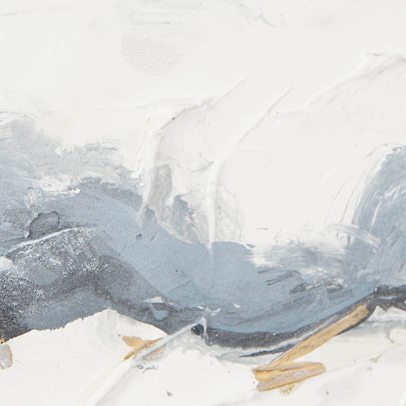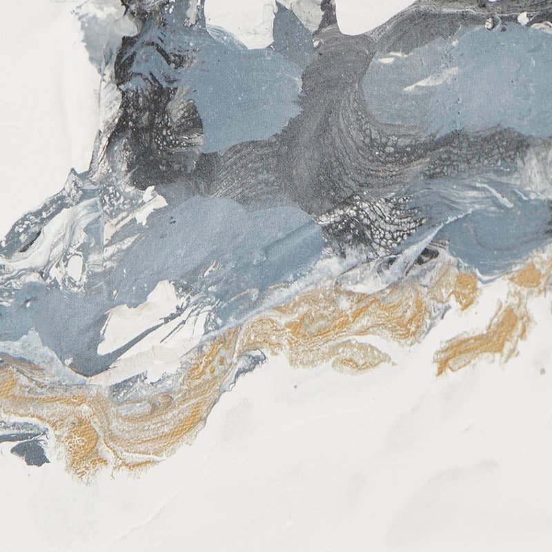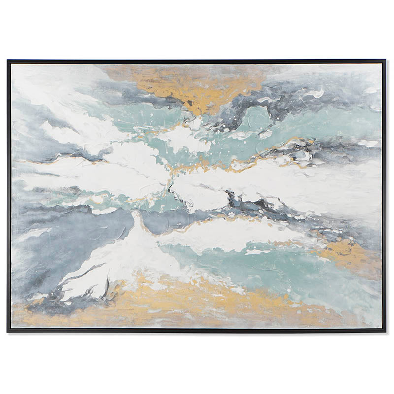 Lienzo tonos Azules, Turquesa, Grises y detalles en dorado sobre fondo claro, pintado a mano. Sobre bastidor de madera, enmarcado con marco negro.