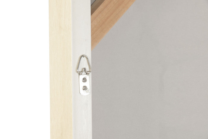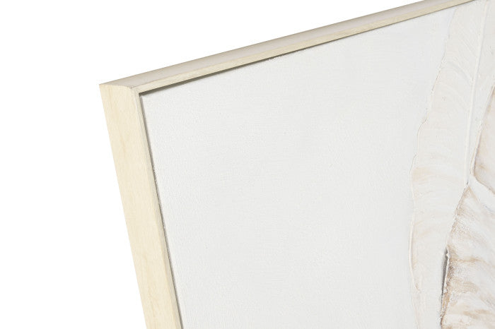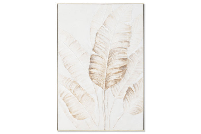 Lienzo con detalle de hojas de palmera en tonos blanco y beige. Acabado pintado a mano. Enmarcado en tono natural.